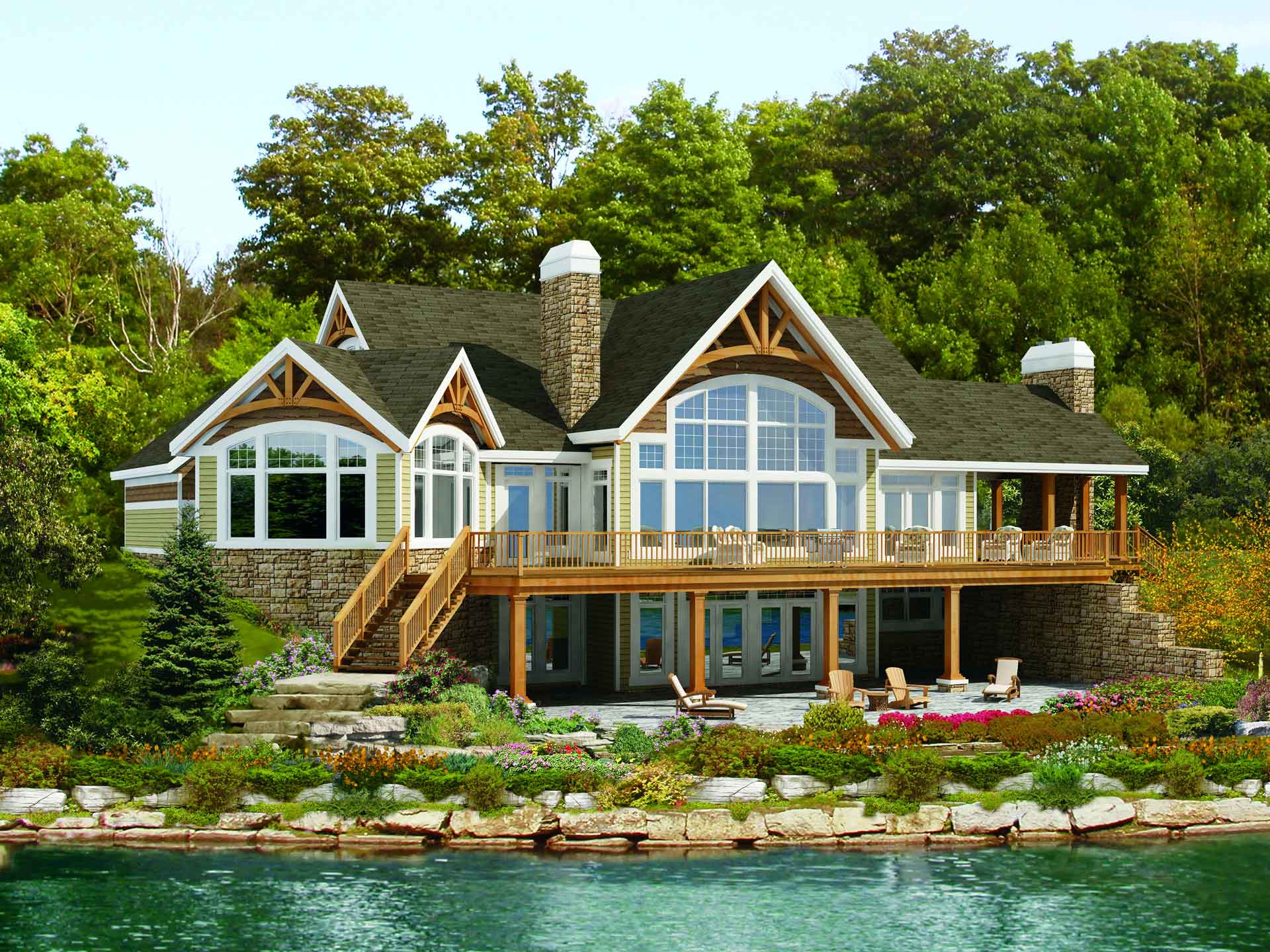 Natural wood timbers with open concept spaces and covered terraces.