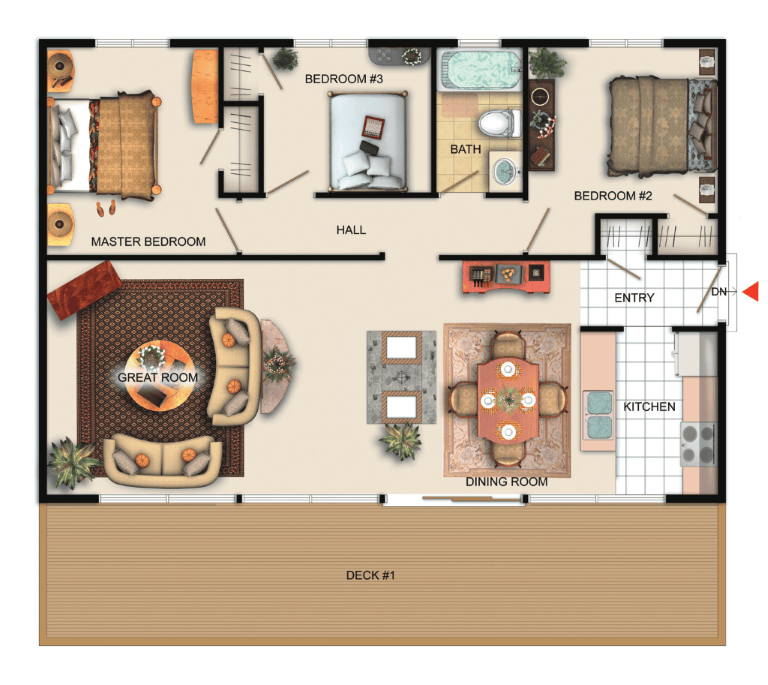 Great Room: 21′-0″ 13′-0″ Kitchen: 8′-0″ x 9′-0″ Dining Room: 10′-0″ x 13′-0″ Master Bedroom: 10′-0″ x 11′-8″ Bedroom # 2: 11′-0″ x 11′-8″ Bedroom # 3: 9′-9″ x 8′-2″