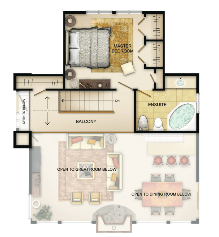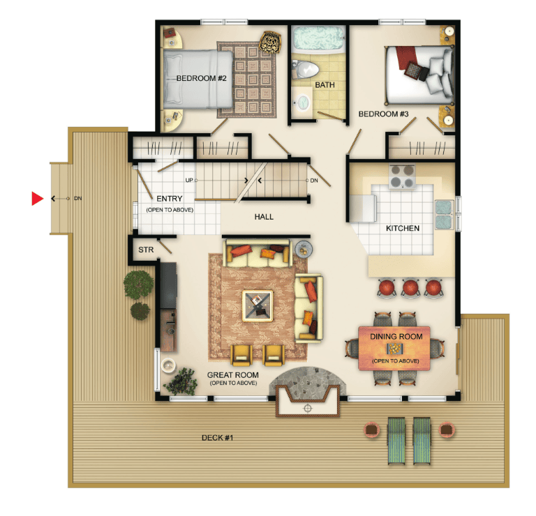 Great Room: 17′-0″ x 14′-6″ Kitchen: 9′-8″ x 10′-0″ Dining Room: 9′-8″ x 11′-4″ Master Bedroom: 12′-11″ x 12′-4″ Bedroom # 2: 11′-8″ x 9′-11″ Bedroom # 3: 9′-9″ x 9′-11″